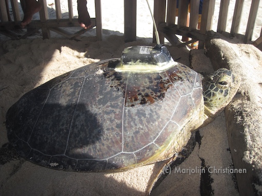 Udayana University (Denpasar, Indonesia) and the joint program WWF Berau, was so kind to provide one of their fastlock gps systems (Sirtrack) to track a green turtle from Derawan to study the movement on its foraging ground. Jaya Rata came all the way from Denpasar to Derawan to attach the Sirtrack transmitter. He has tagged a lot of turtles in Indonesia.