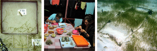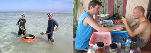 Left: Sarah ready to harvest seagrasses from our cage. Right; our hosts and great cooks on Derawan Islands.