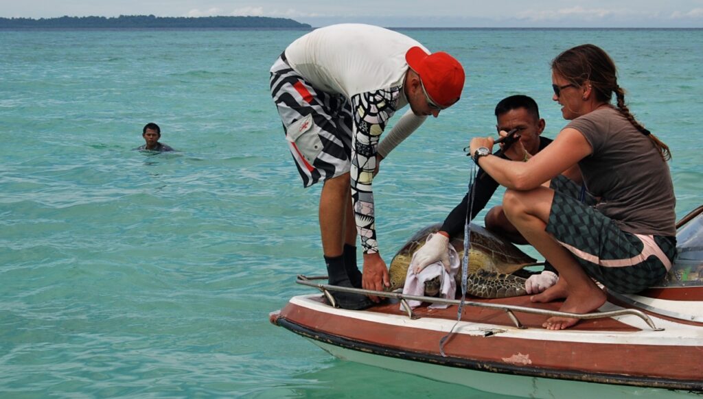 In total now we captured and measured more than 800 green turtles around Derawan and tagged 500 of them. The WWF guys (Udin, Darjon), some locals (Jeffrey, Tiar) and we catched them using the rodeo technique. This year we recaptured some individuals that we tagged previously in 2009 on Derawan Island. These turtles grew 3-6 cm (curved carapace lenght) or 3-10 kgs. On her first day on Derawan my sister Sabine saw green turtles in all kind of sizes and activities; she saw an female laying eggs, and small hatchlings coming out of their nest and she was my research assistant while cathcing green turtles in the seagrass meadow. Again a lot of pictures, enjoy because this will be the last pictures from the field for a while!