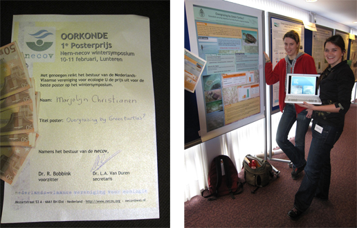 The second day it was time for Madelon and me to present our poster “Overgrazing by Green Turtles?” (PDF) together with 45 others. The poster were evaluated on scientific quality, clarity and attractiveness. Not without succes, like you will see below we won the NERN and NECOV 2009 posterprize, and 300 euros! We are very happy with this result, now its time to write an article from it to apply for the PhD paper award next year ☺