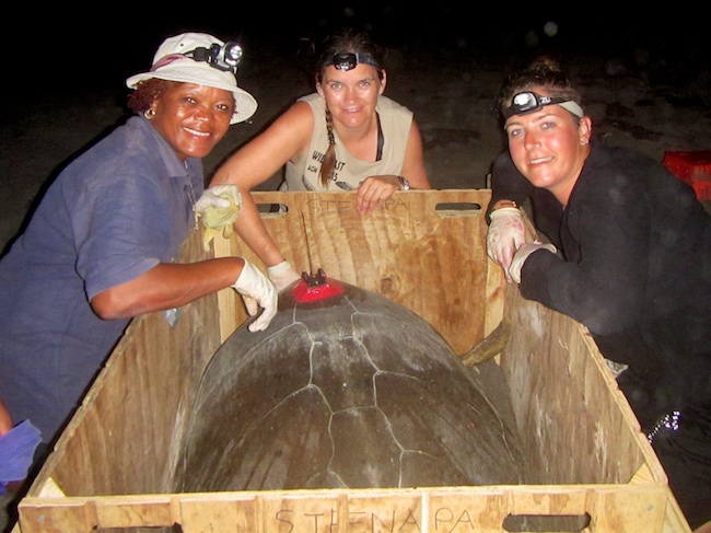 We deployed this turtles with a satellite transmitter to study where she will go during the inter-nesting period (turtles lay multiple nests with ± 2 wks intervals) and after nesting, when she is migrating back to her foraging grounds. These foraging grounds can be located up to 5000 km away, for which the turtle might have to risky waters of multiple countries (of which some allow turtle harvest). 2 and 4 nights later we placed a 2nd and 3rd transmitter on other nesting females, great succes! In future blog-posts I will share their migration tracks.
