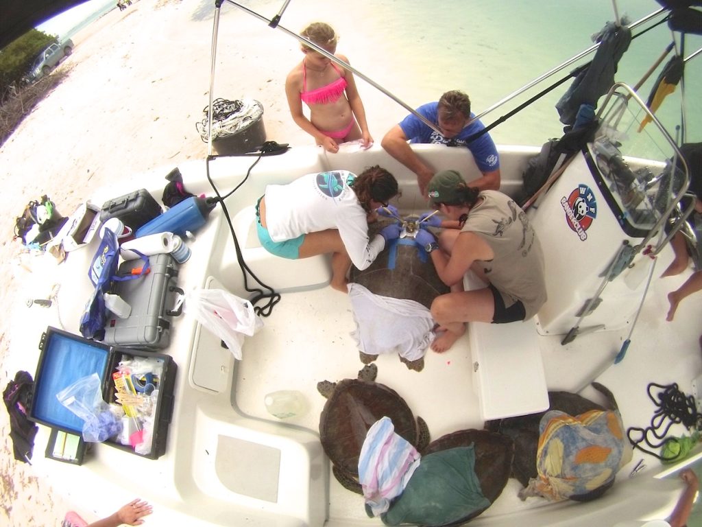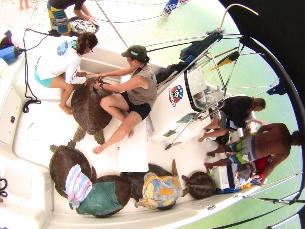 4 sub-adult green turtles that we caught in Lac Bay are now equipped with satellite transmitters to study their movements and use of the seagrass meadows, (see photos below).