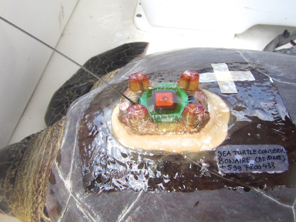 Are you diving in Bonaire and have you seen green turtles with satellite transmitters? Report your observations by sending me an email or respond to this post! Just describe, where and when you have seen the turtle. Which turtle did you see? You might have notice a mark? Every turtle has an individual colored mark next to the transmitter. Marks are: a blue “A”, pink square, yellow triangle, white cross, red circle.