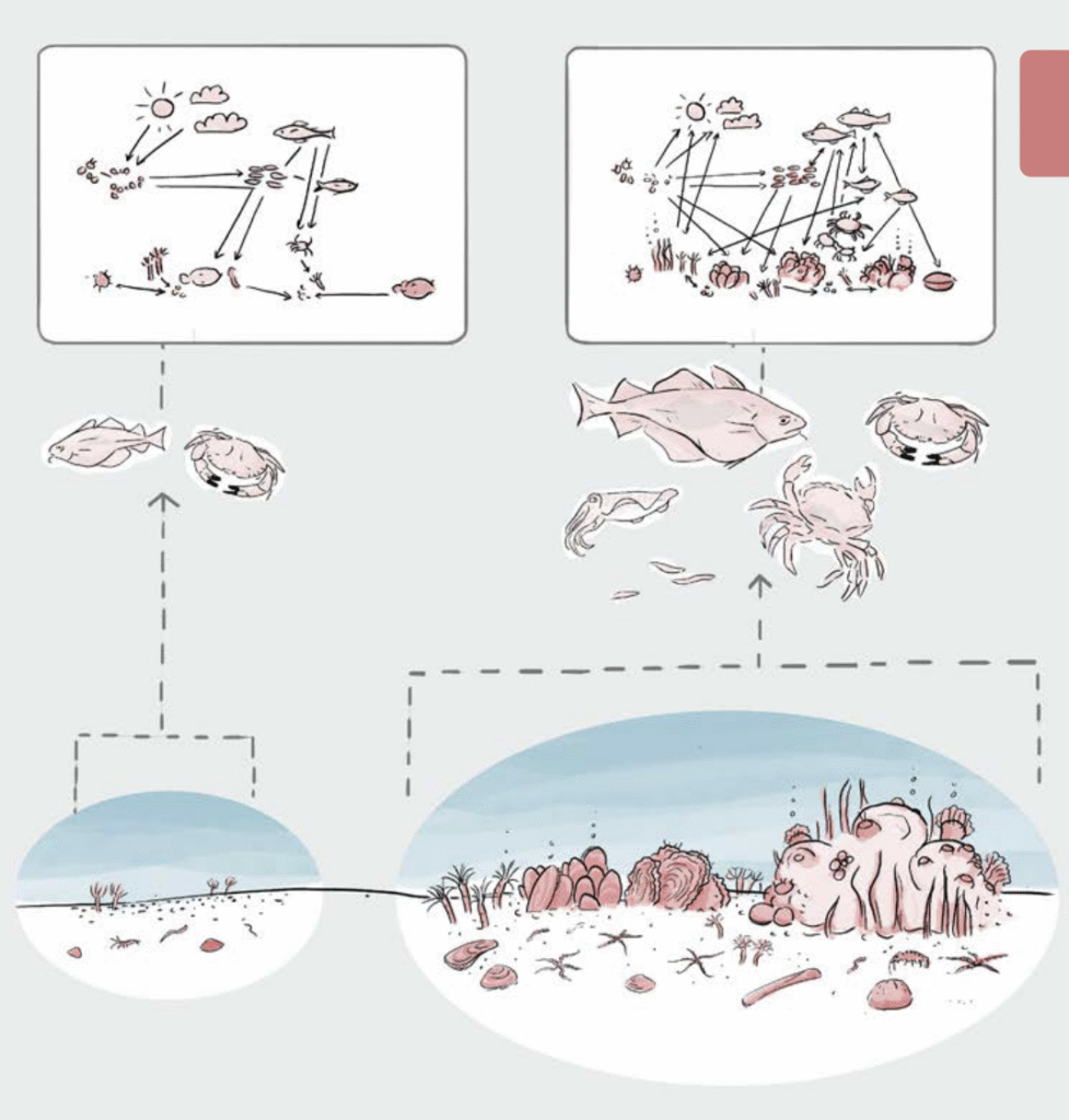 In our new study – led by Caterina Coral – we compared remnant biogenic and geogenic reefs with sandy seafloor habitats. We found that reefs increase biodiversity and food-web complexity, supporting species such as edible crab (Cancer pagurus) and pouting (Trisopterus luscus). These networks are more connected and resilient, meaning reefs help stabilize marine ecosystems.