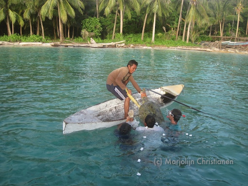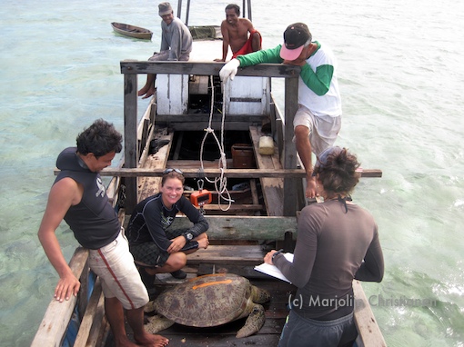 The sizes (of the carapace) ranged from 40 to 112 cm, the weight from 8 to 116 kg’s. The most of them were catched in nets by a team of us; Sarah, Sjoerd and me, and 4 enthusiastic Derawanese locals in a fishermen’s boat. For 3 days the local assistants of Pak Rusli from the WWF-TNC joint program Berau catched extra turtles with the rodeo method by jumping from a speedboat. The coming month we will try to spot our tagged/painted turtles back, so that we can learn about their movement and the population size. In addition we are also cooperating with Udayana University to study the population genetics of these turtles.